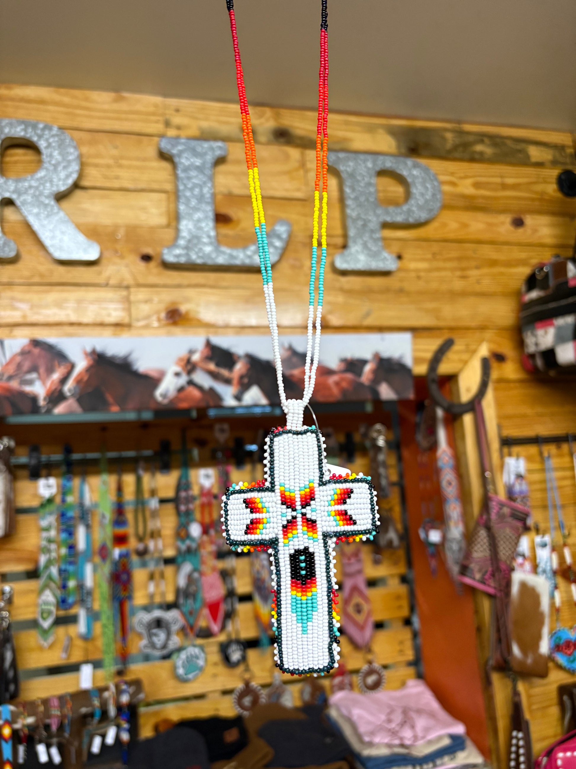 This hand-beaded cross necklace features a leather back for added durability. Its unique design allows it to be worn or displayed anywhere you choose, making it a versatile accessory for any outfit.