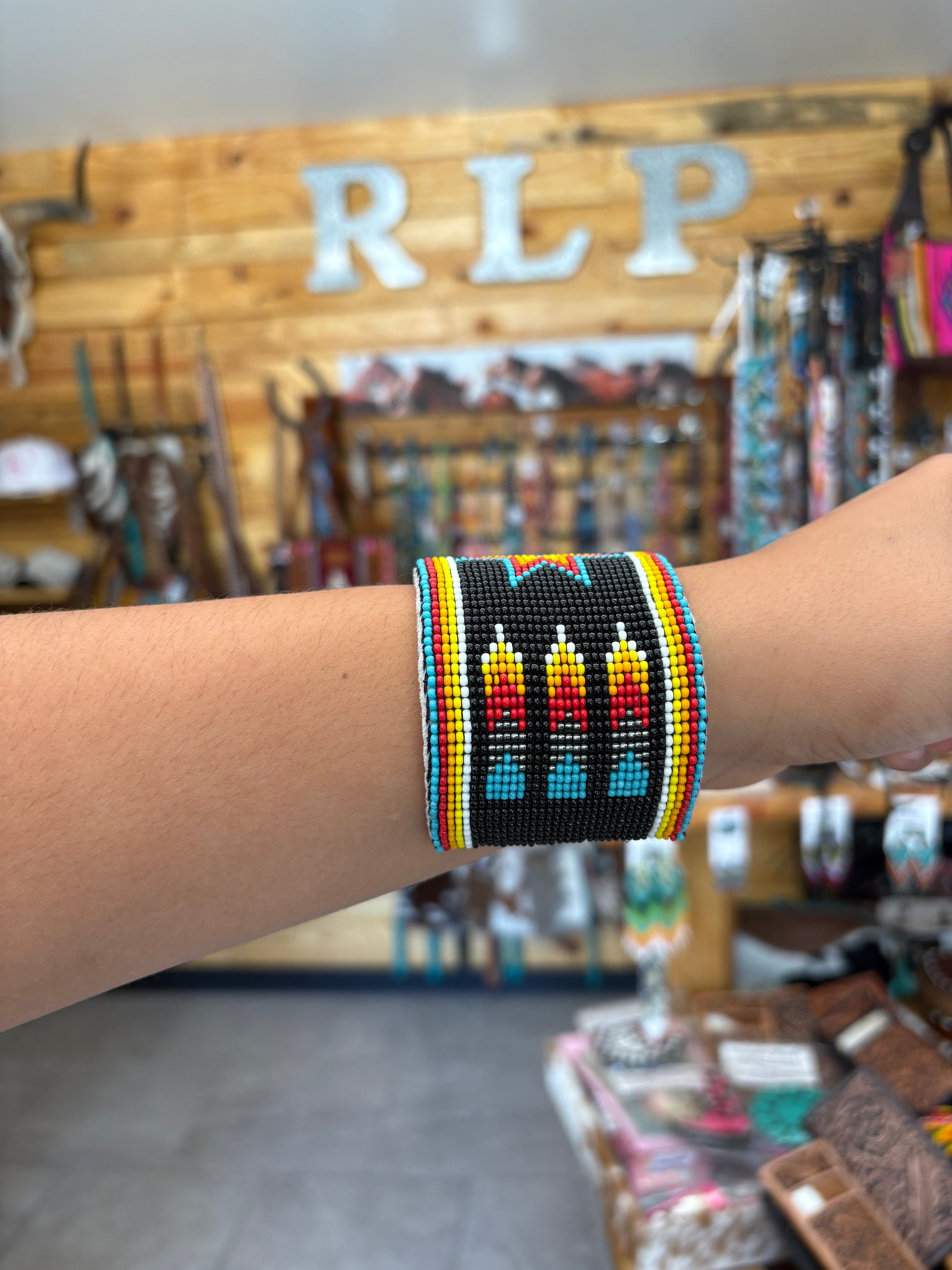 This beaded cuff measures 2 inches wide and 7.5 inches long, with hand-stitched beads on a suede leather bottom. Its adjustable size ensures a comfortable fit for your wrist.