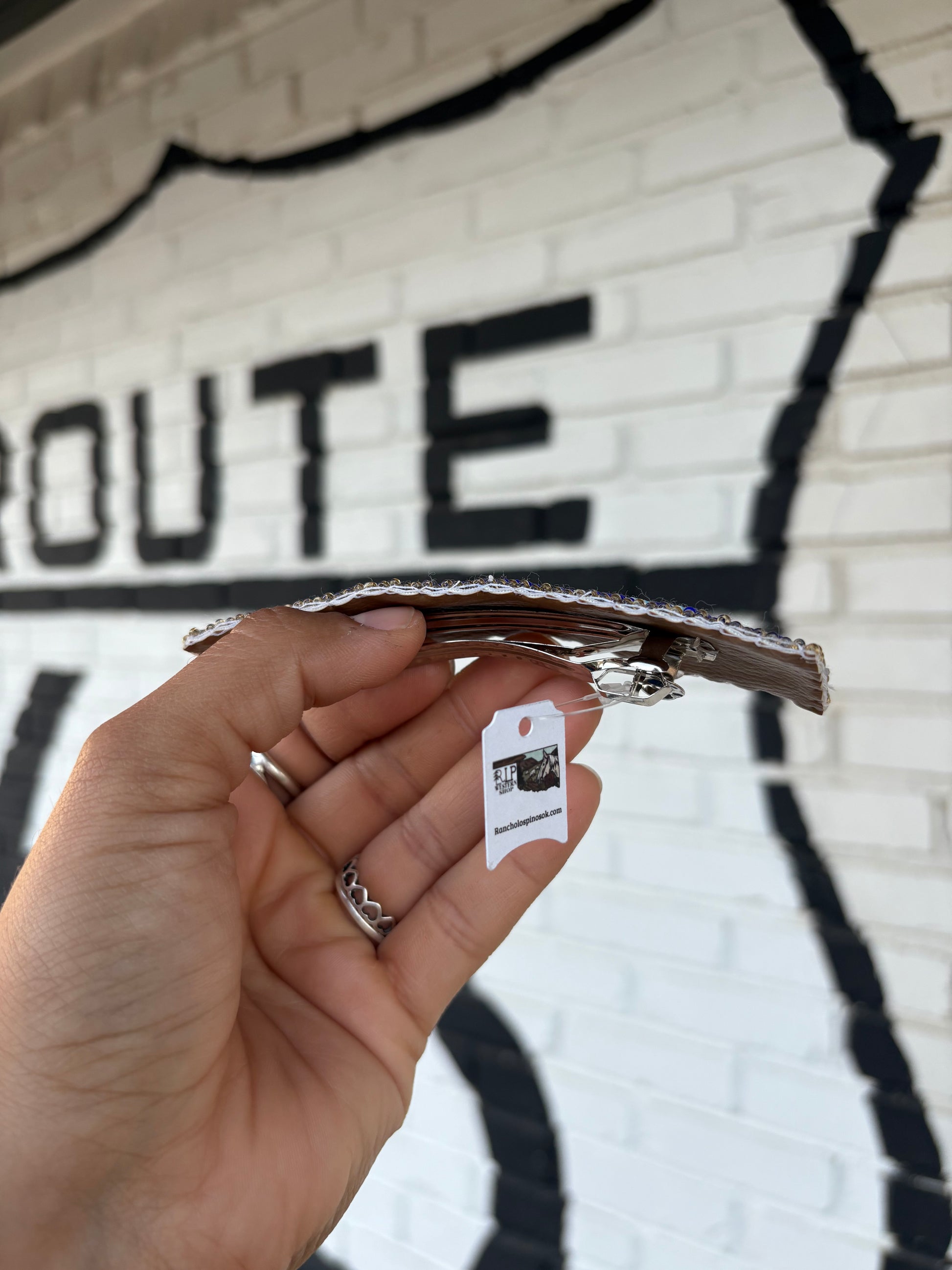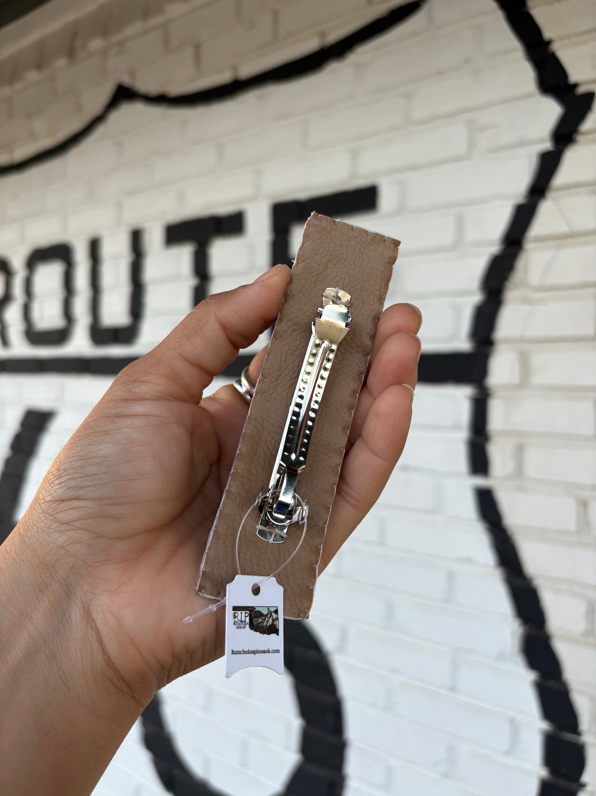 This Beaded Barrette measures 5 inches in length and 1 inch in width. This stunning accessory is intricately handcrafted with 100% beads and features a durable leather backing. The clip is designed to securely hold your hair in place.