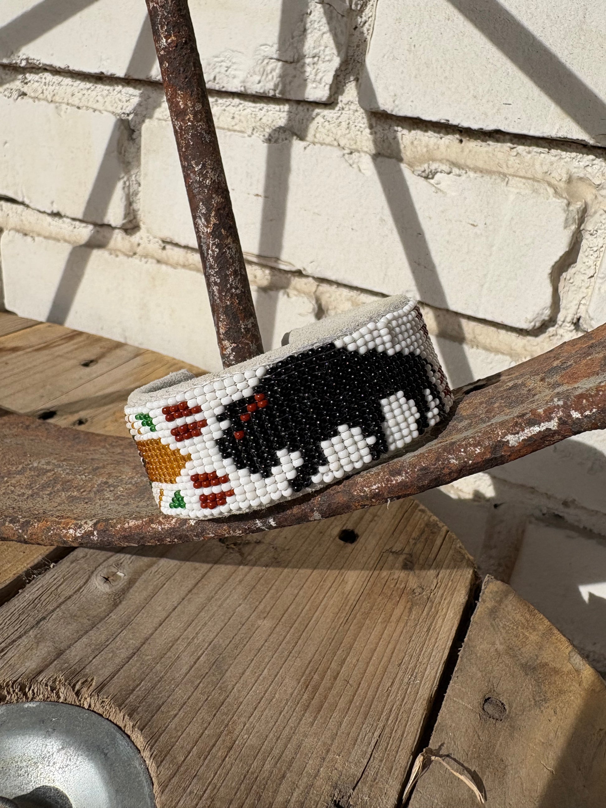 This Beaded Leather Cuff measures 7.5 inches in length and 1 inch in width. Buffalo with color pop. Handbeaded. Cuff is Adjustable to your wrist.