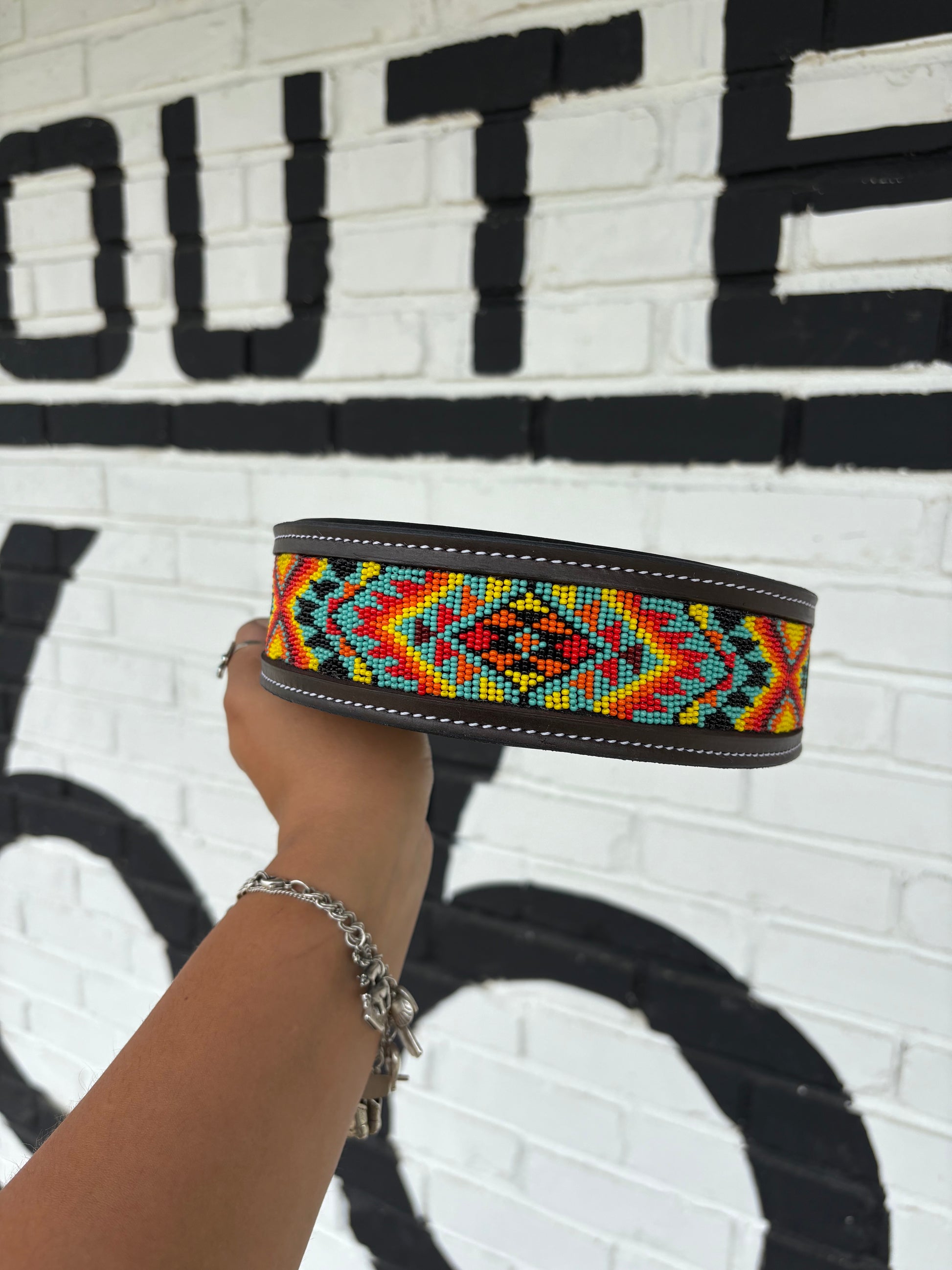 100% hand beaded and hand-tooled. Dark Brown Leather. Black padded underside.