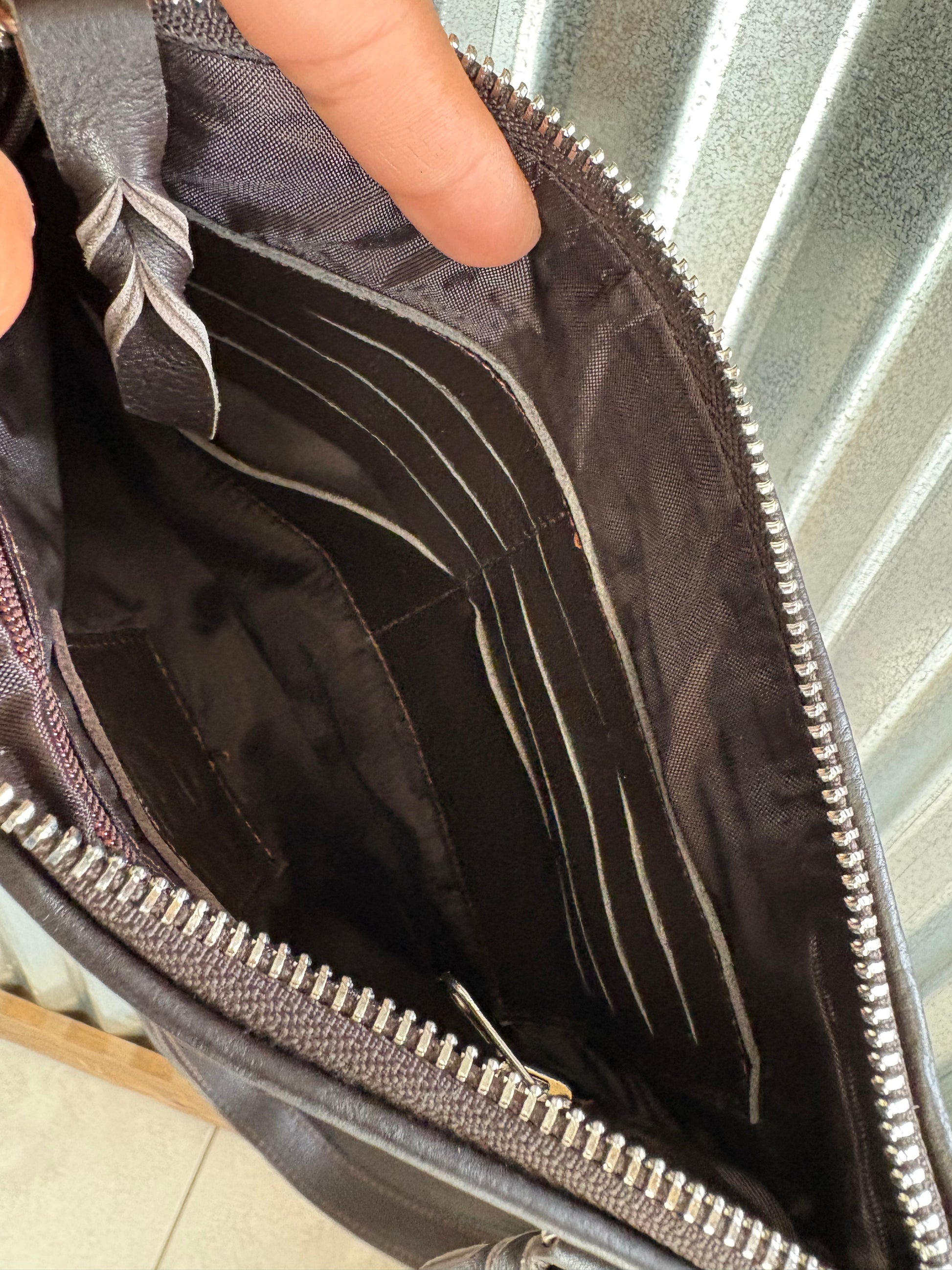 The purse features a zipper closure that extends along its entirety as well as an interior zipper compartment. Additionally, the bag has multiple compartments located on the front and throughout, providing ample storage options for all your belongings.