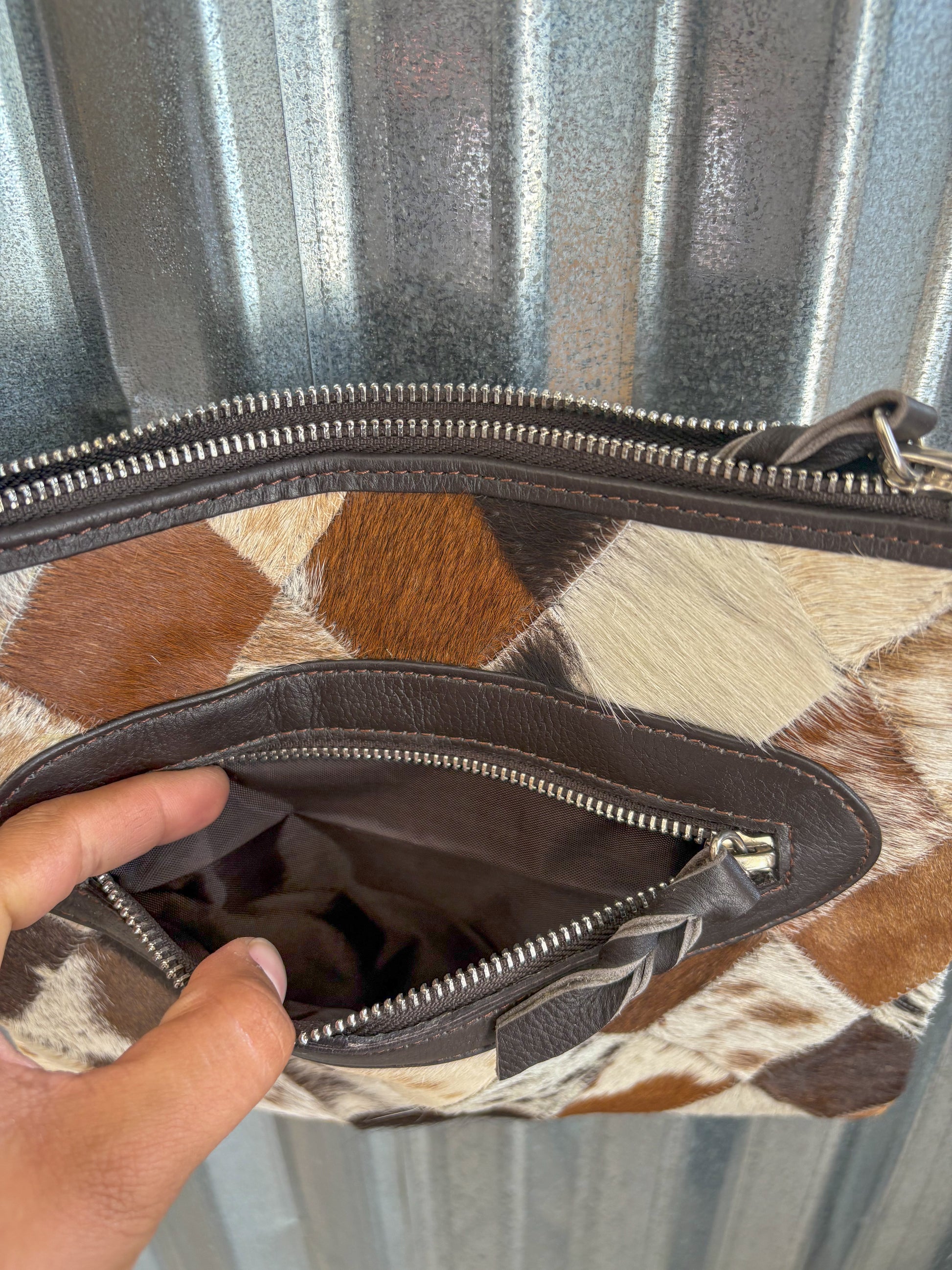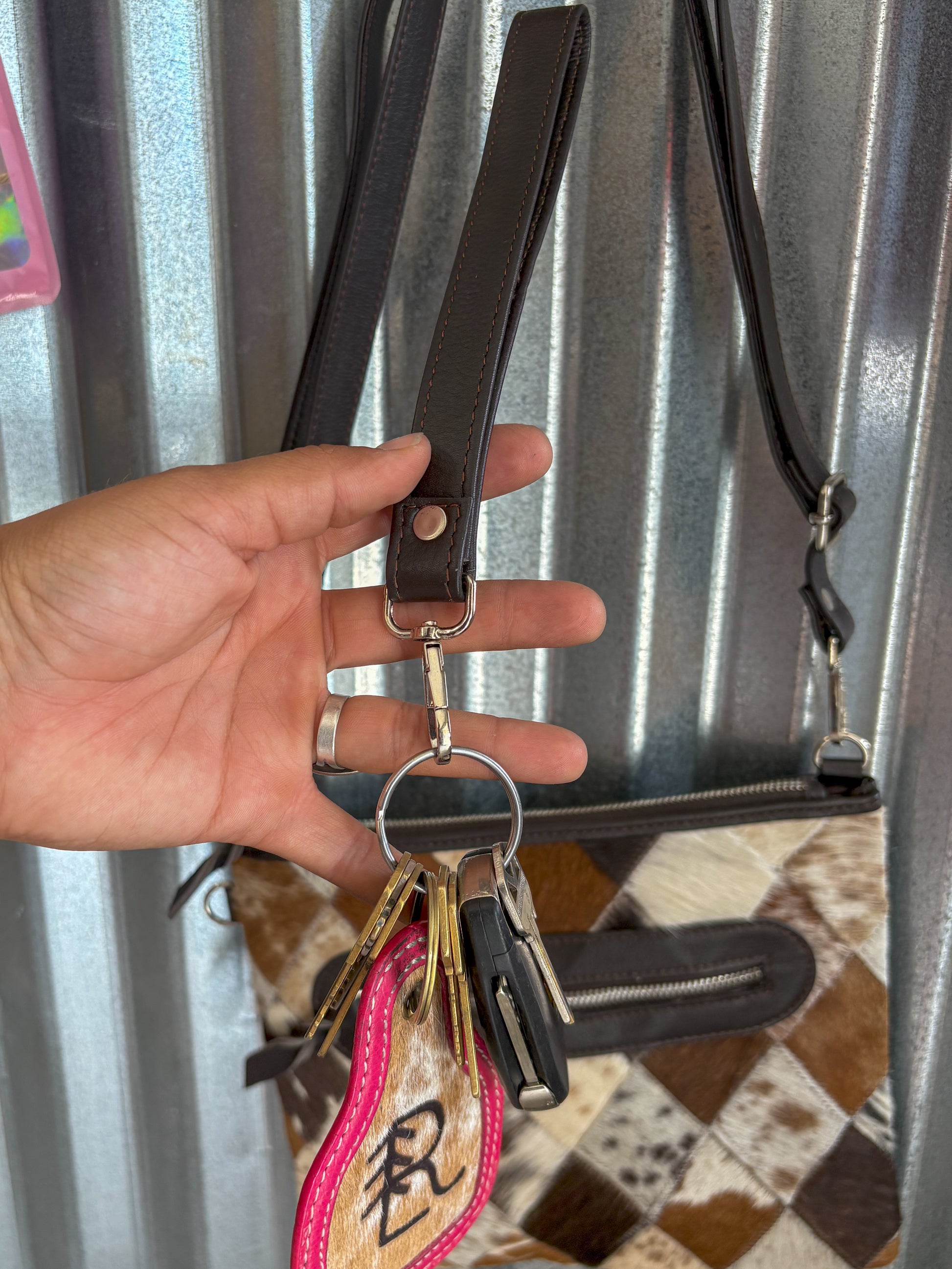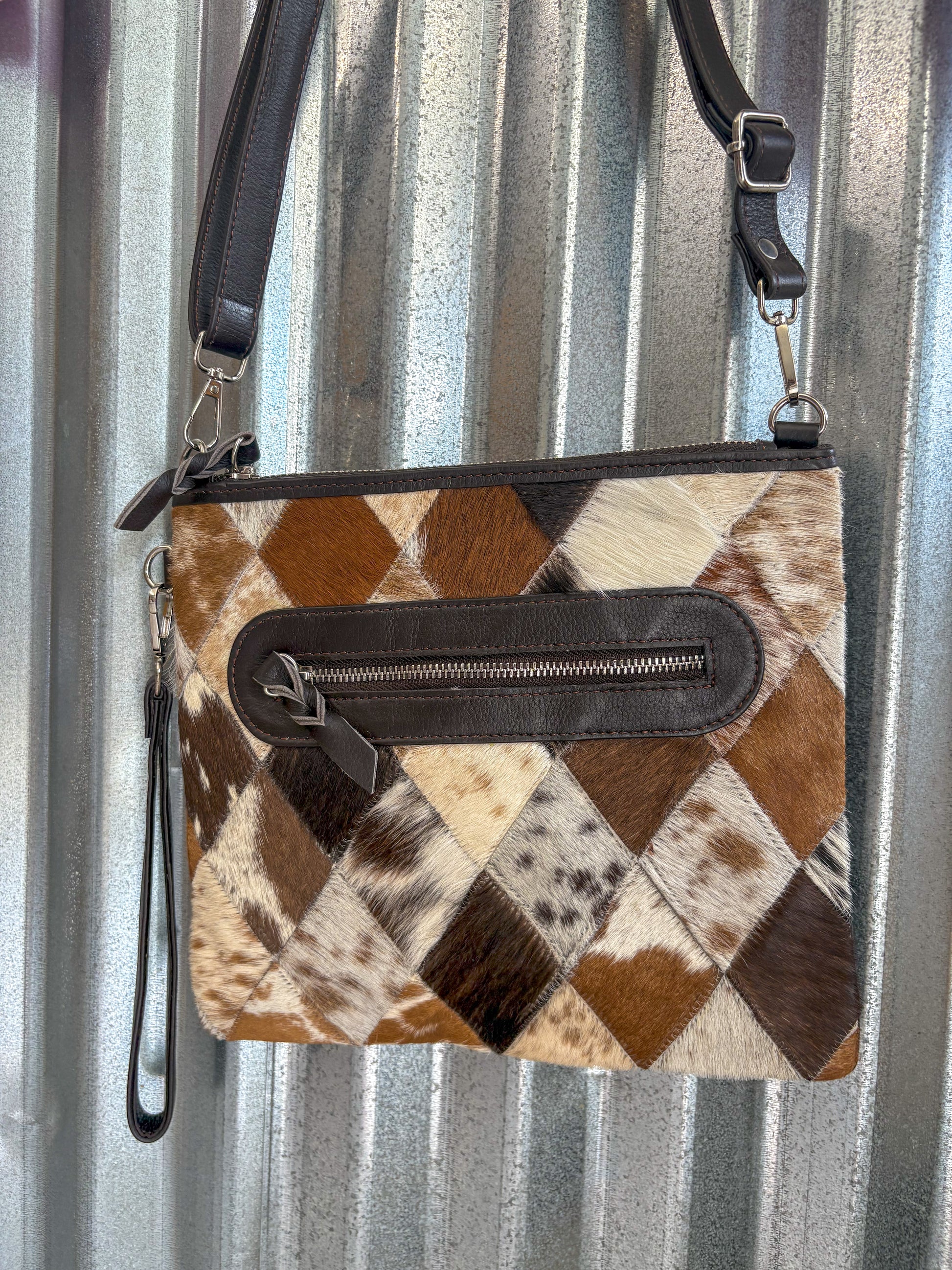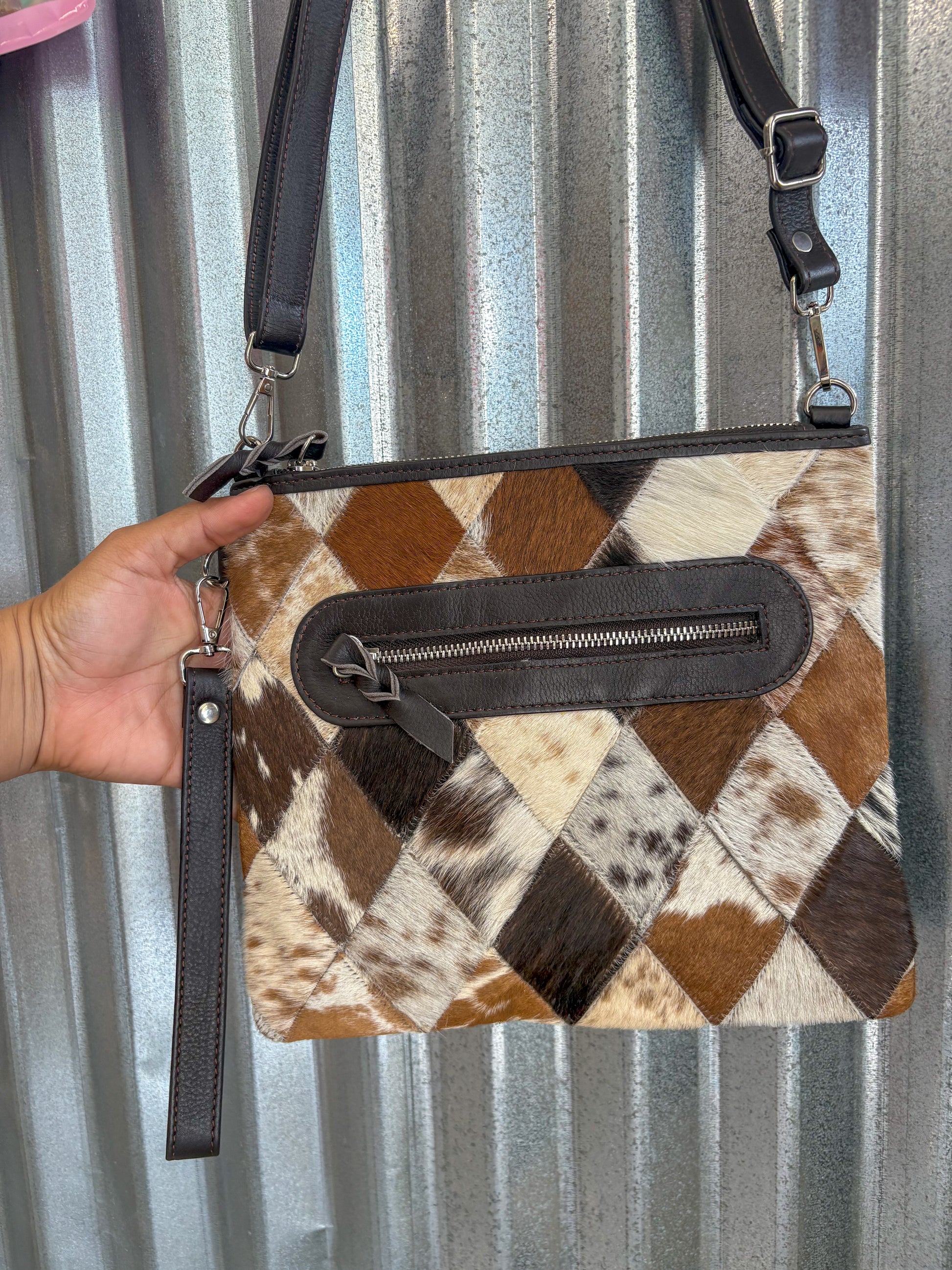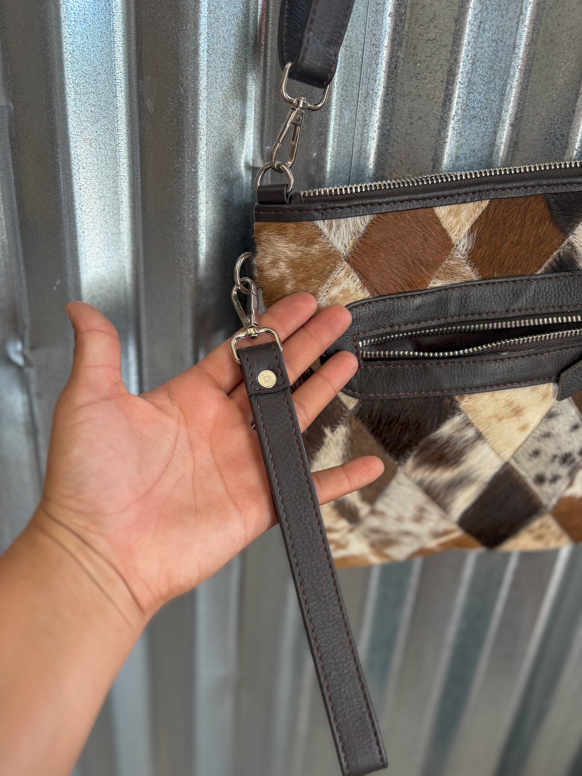 This Cowhide Diamond Patch SidePurse / Wristlet is versatile and spacious, perfect for all your essentials. It can be paired with the matching wallet and has an adjustable strap with a Keychain wristlet for easy carrying.