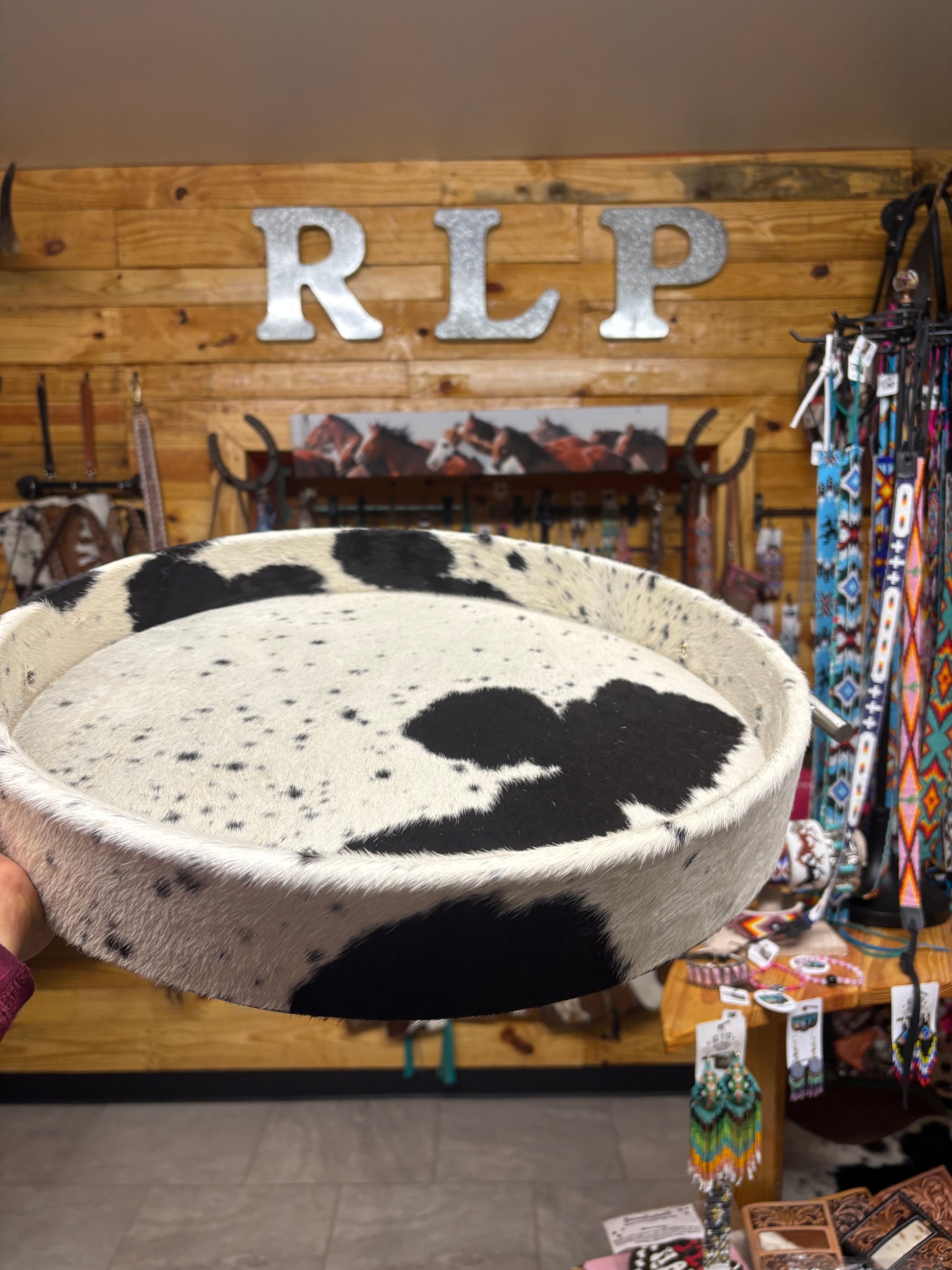 This cowhide tray is truly versatile, measuring 16 1/2 inches in diameter and made of genuine leather. Use it on your coffee table, in your bathroom and bedroom, or at craft shows or in your store/boutique for a stunning display! It’s our biggest size and gorgeous.