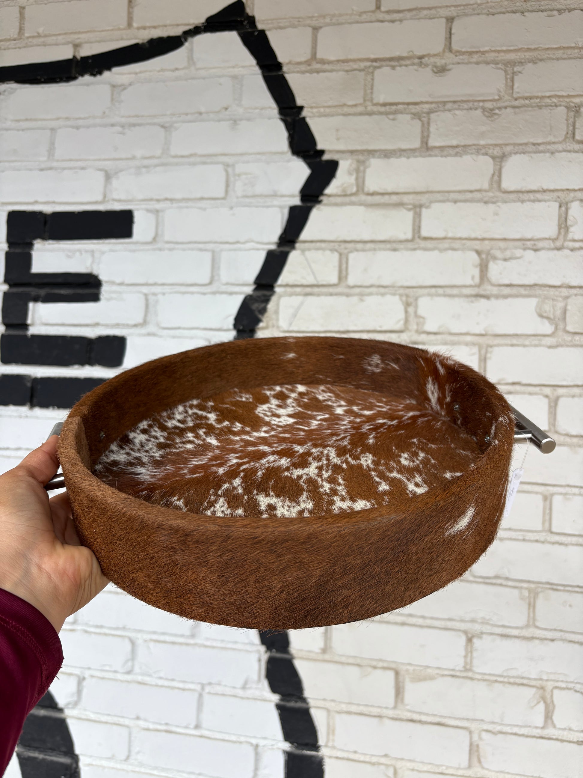 This 12-inch diameter tray is constructed of genuine cowhide and has a leather bottom. It can be used in multiple rooms, including the living room, bedroom, bathroom, or entry table. Its versatility, stunning appearance, and practicality make it a great addition to any home.