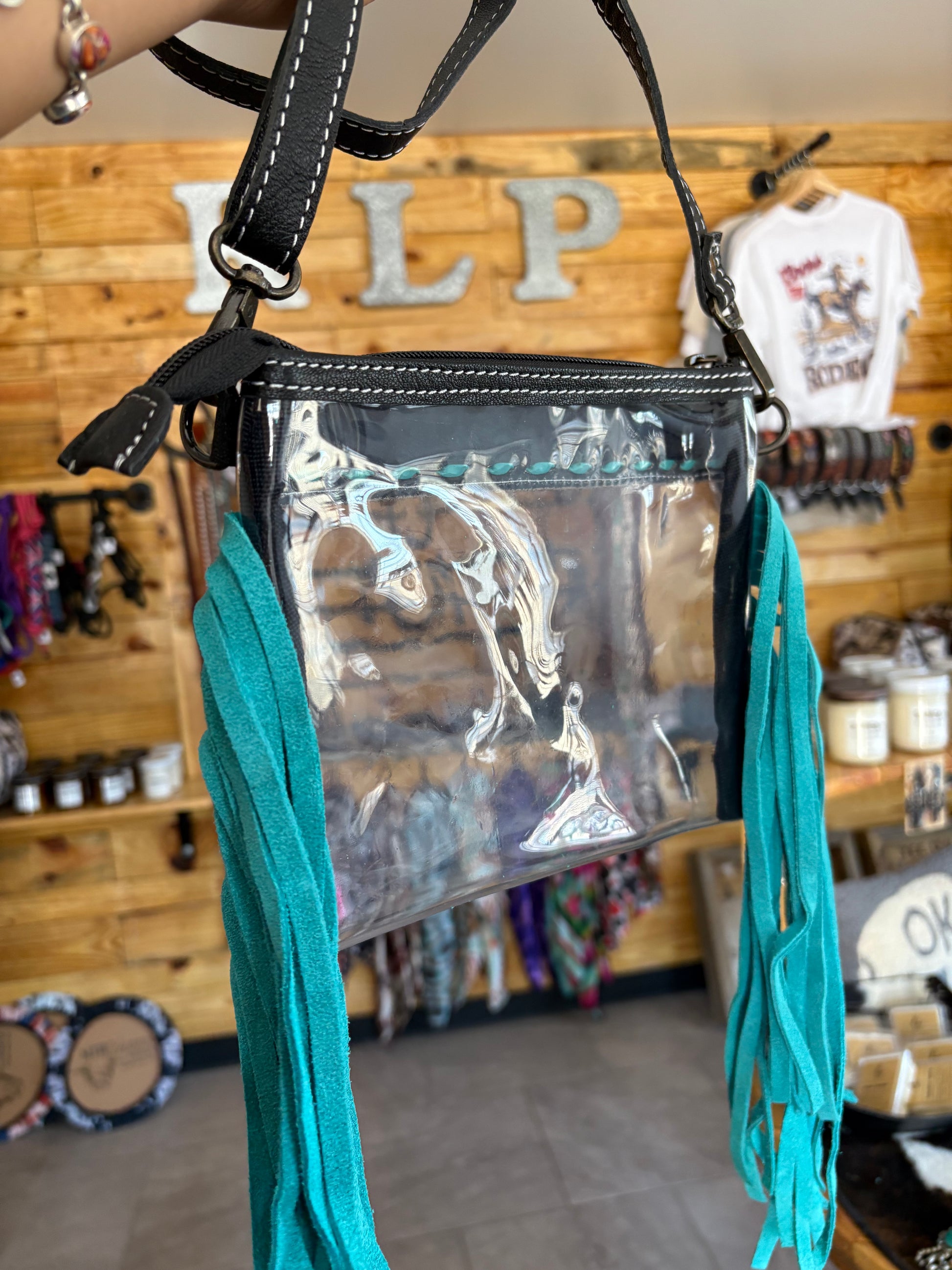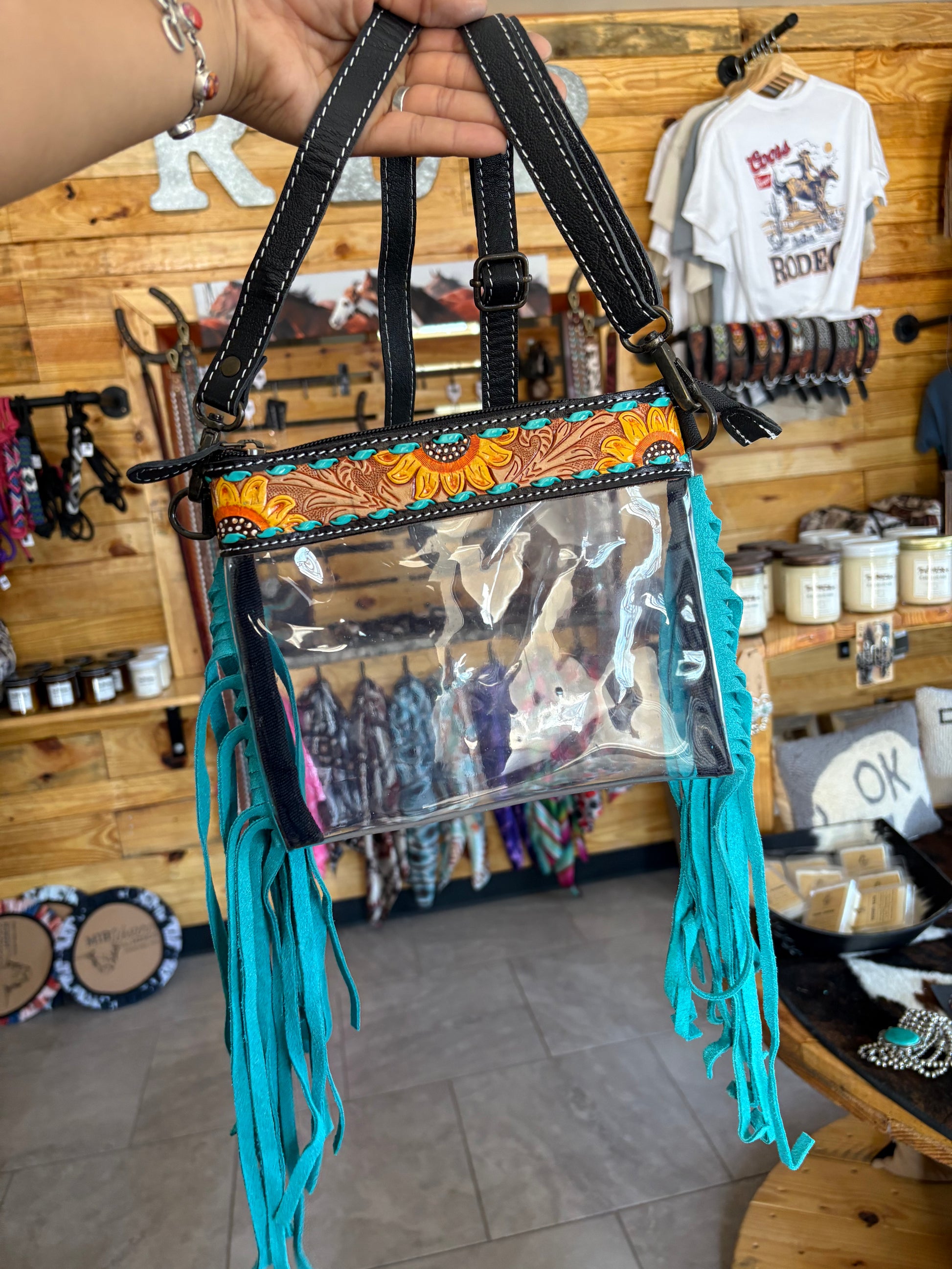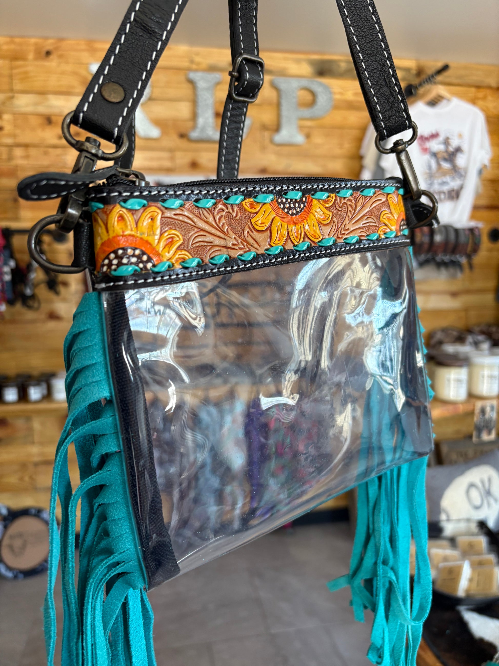 Expertly crafted with a clear design, this bag is ideal for concerts and schools. Its compact size is perfect for carrying all your essentials. The intricate hand tooled sunflower design and turquoise lacing add a touch of beauty to the overall look.