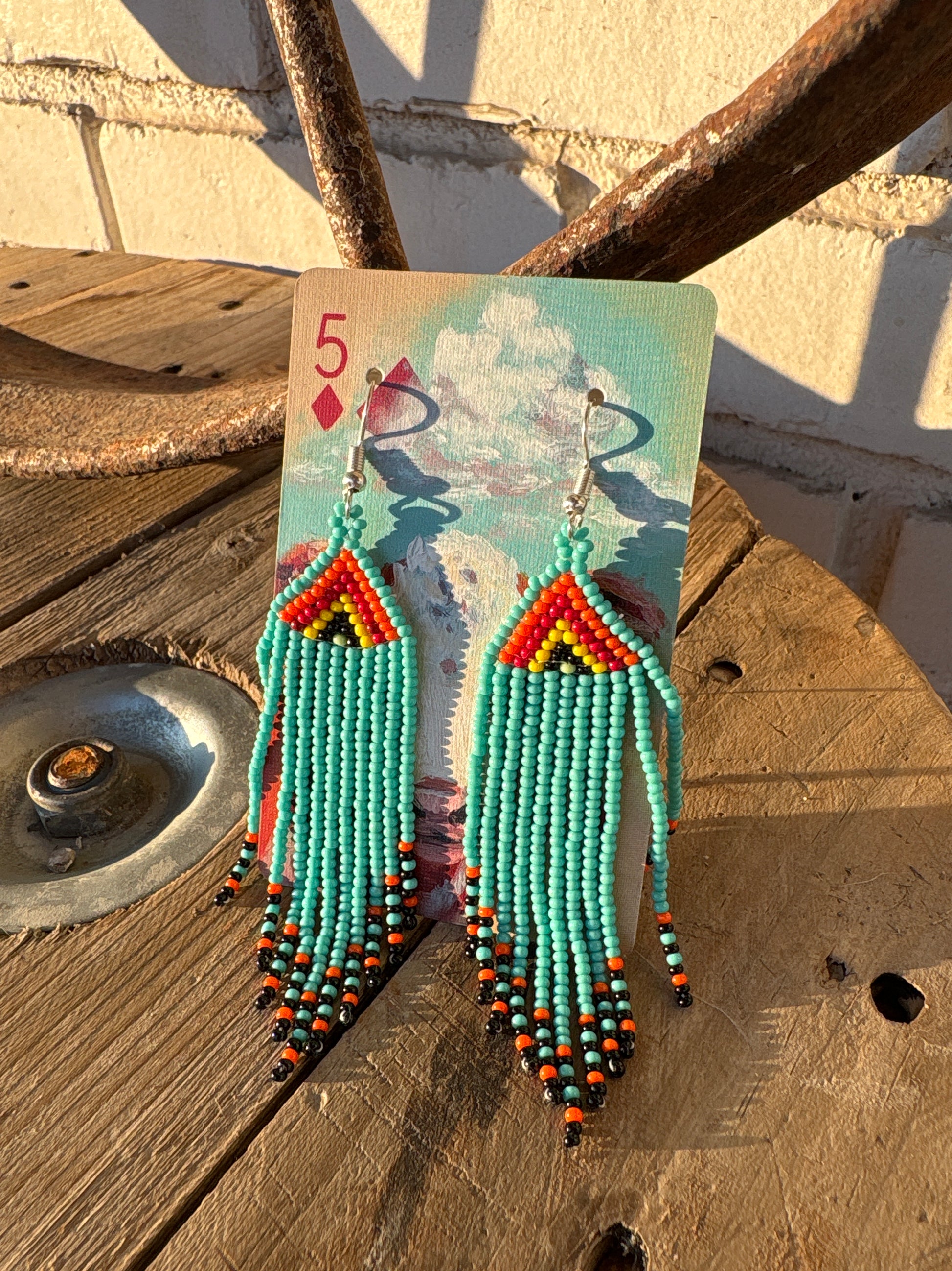 These earrings are the perfect complement to the turquoise diamond necklace and bracelet, measuring 3 1/2 inches in length.