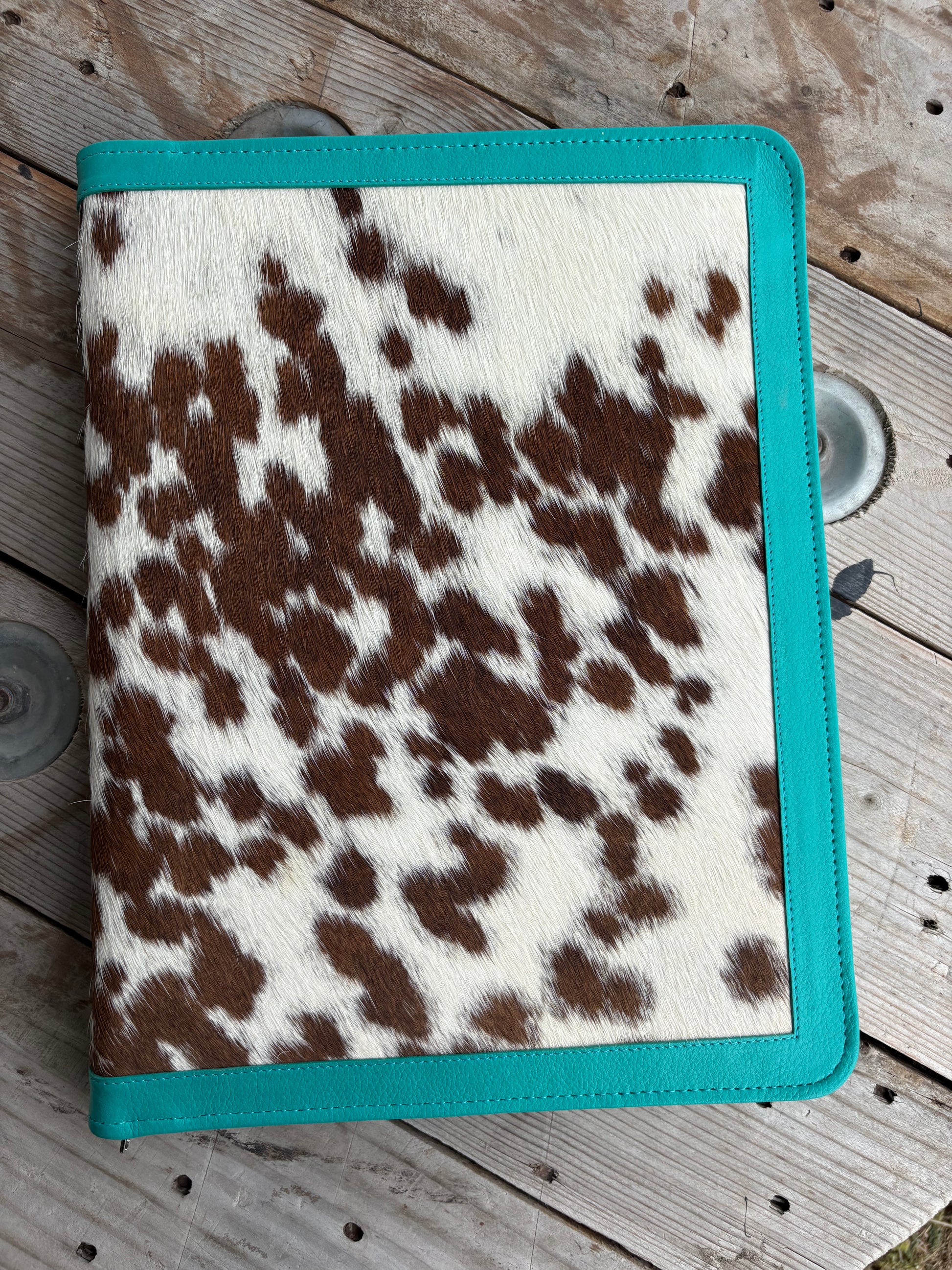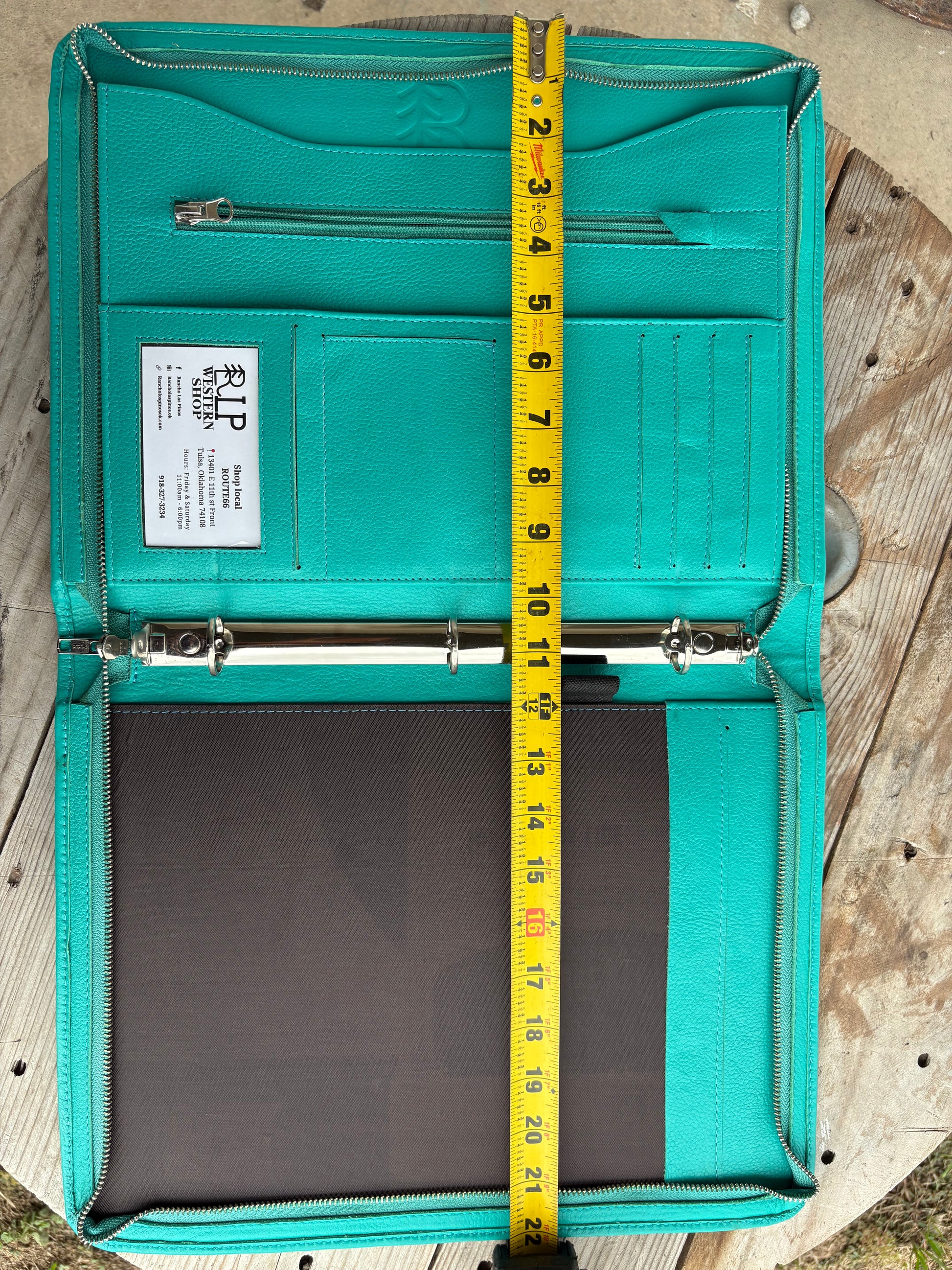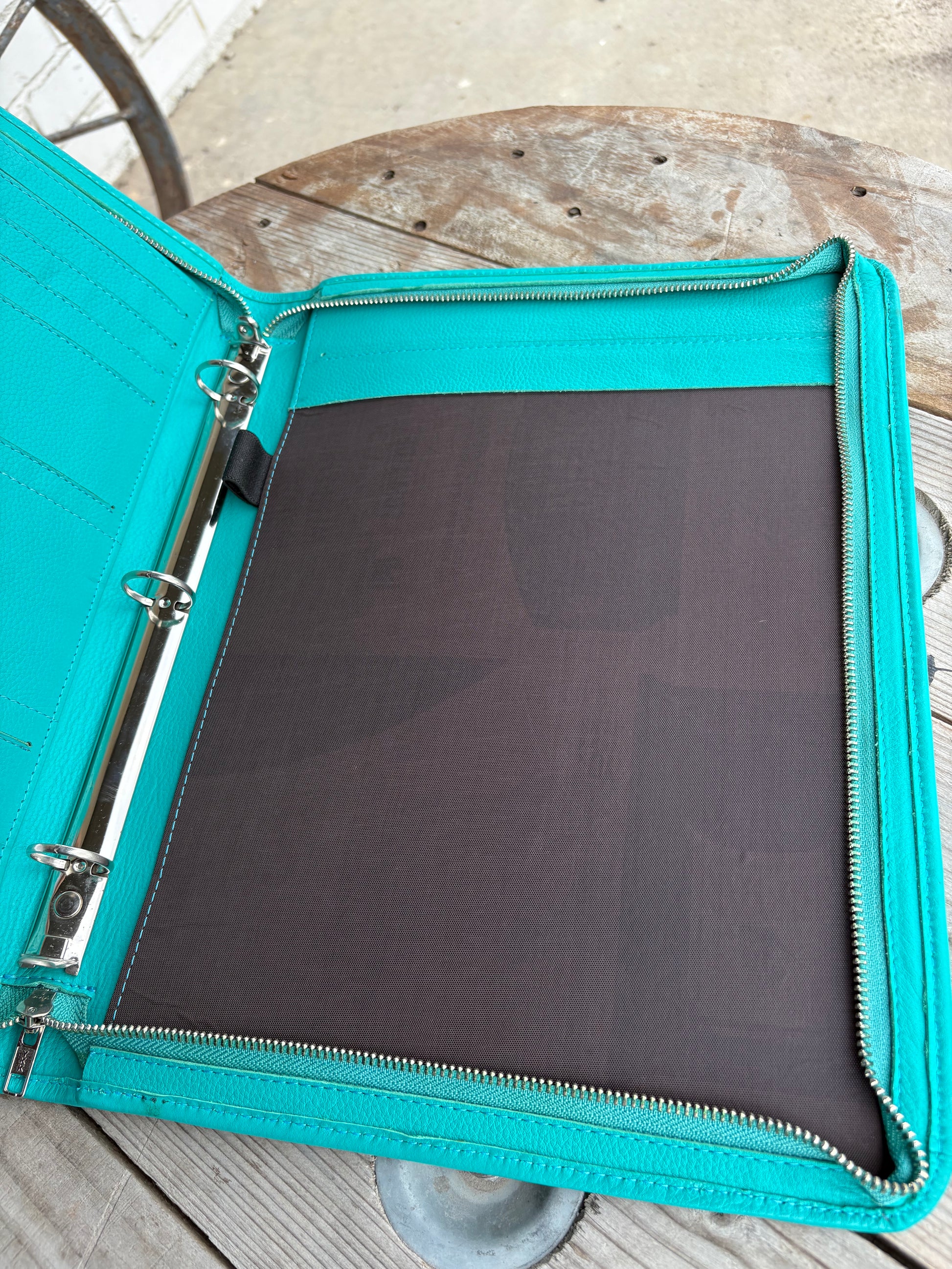 This binder, made of genuine cowhide and leather, measures 14.25” x 11” and features a 3-ring design, a pocket for a legal pad in the back, and a zipper pocket. This binder zips shut so your documents can be safe without falling out. It also has 7 card/pocket slots, an additional space for documents in the front, and a slot for a pen. This is the exact binder that will be sent to you.